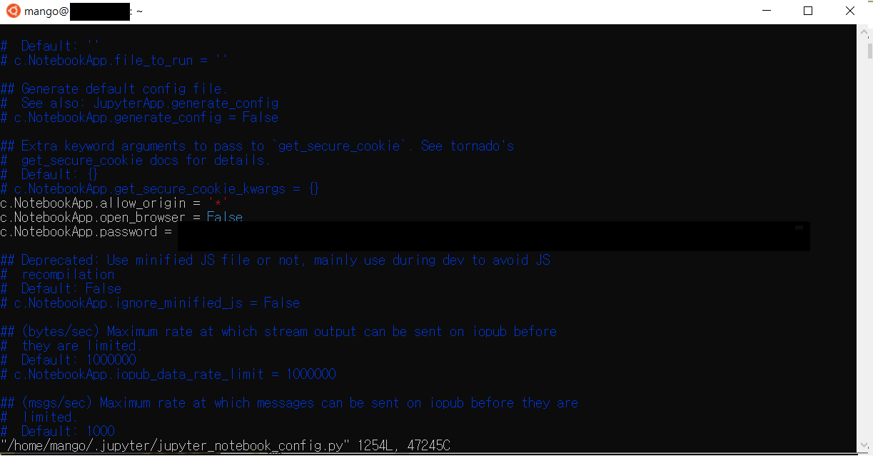 c.NotebookApp.password = '주피터 노트북에서 설정한 후 패스워드'