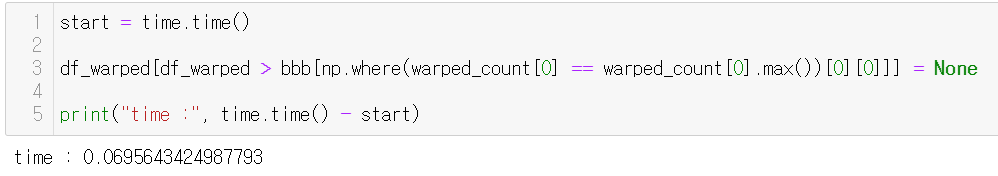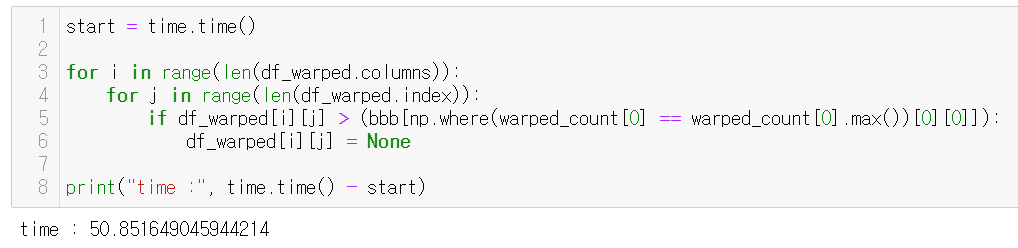 기존에는 이중포문으로 시행을 했었으며, 출력된 시간을 확인하면 시간이 꽤 소요된다는것을 알 수 있다.