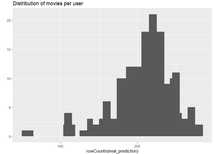 eval_prediction 객체는 평점 매크릭스유형이다. 사용자별로 얼마나 많은 영화를 추천하는지 살펴본다. 이를 위해 사용자별 영화의 분포를 시각화할 수 있다.