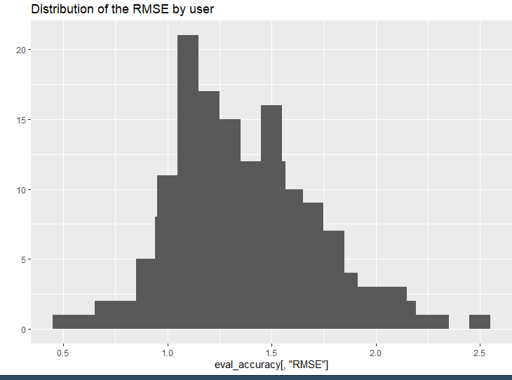 RMSE의 범위는 대부분 0.8에서 2.0 사이며, 각 사용자의 모델을 평가했다. 전체 모델의 성능 지표를 확보하려면 byUser = FALSE를 지정해 평균 지수를 계산해야 한다.